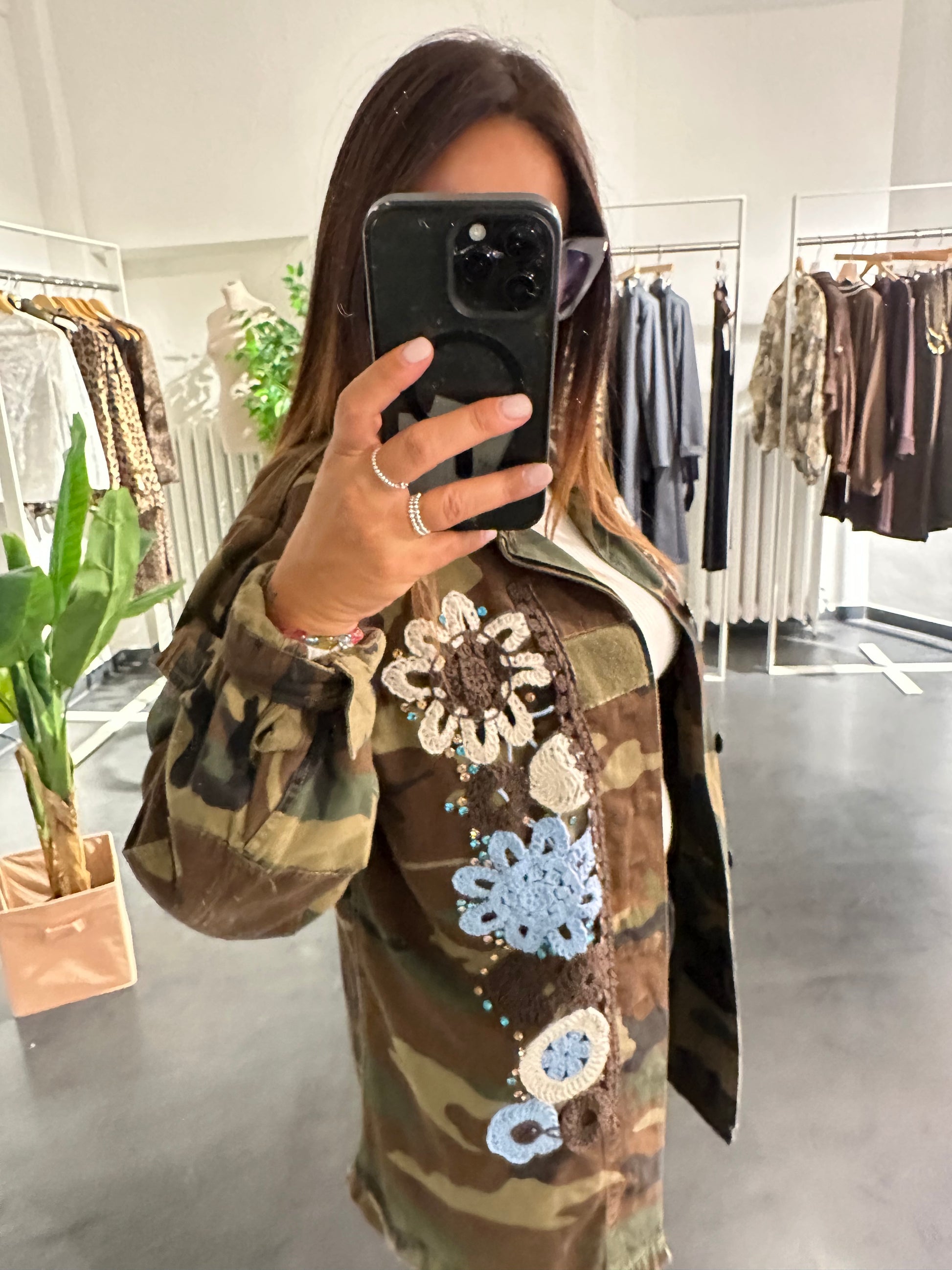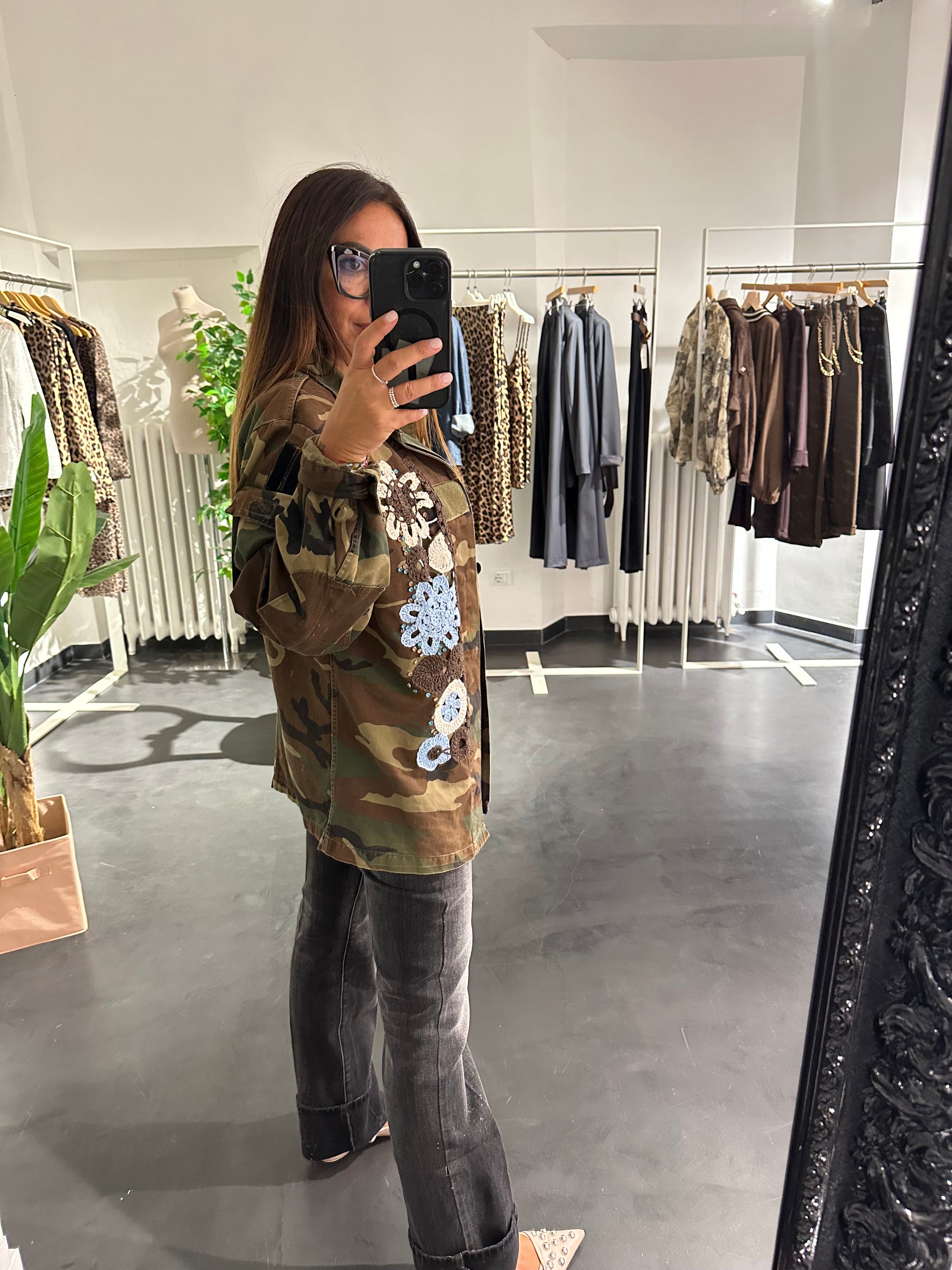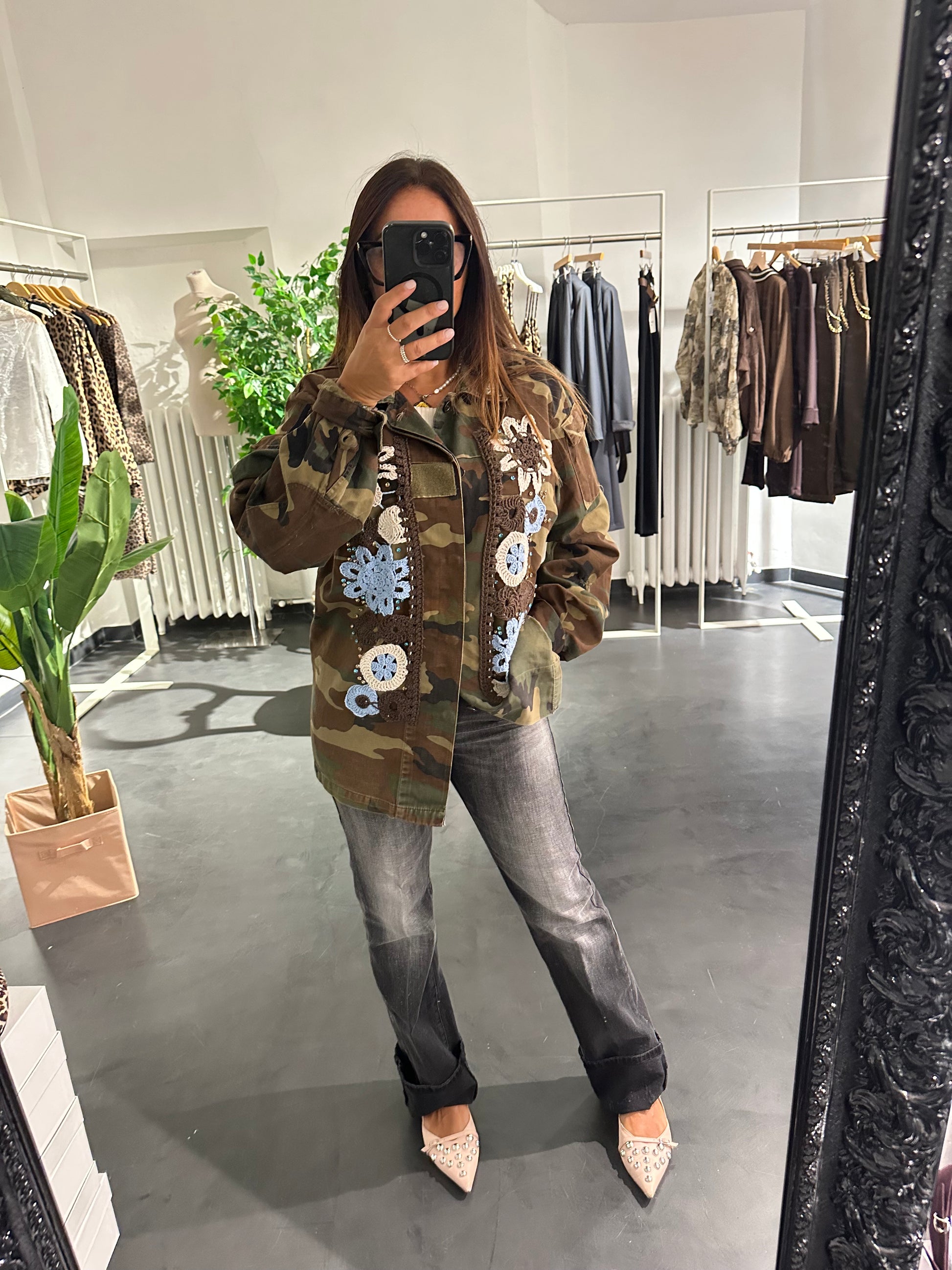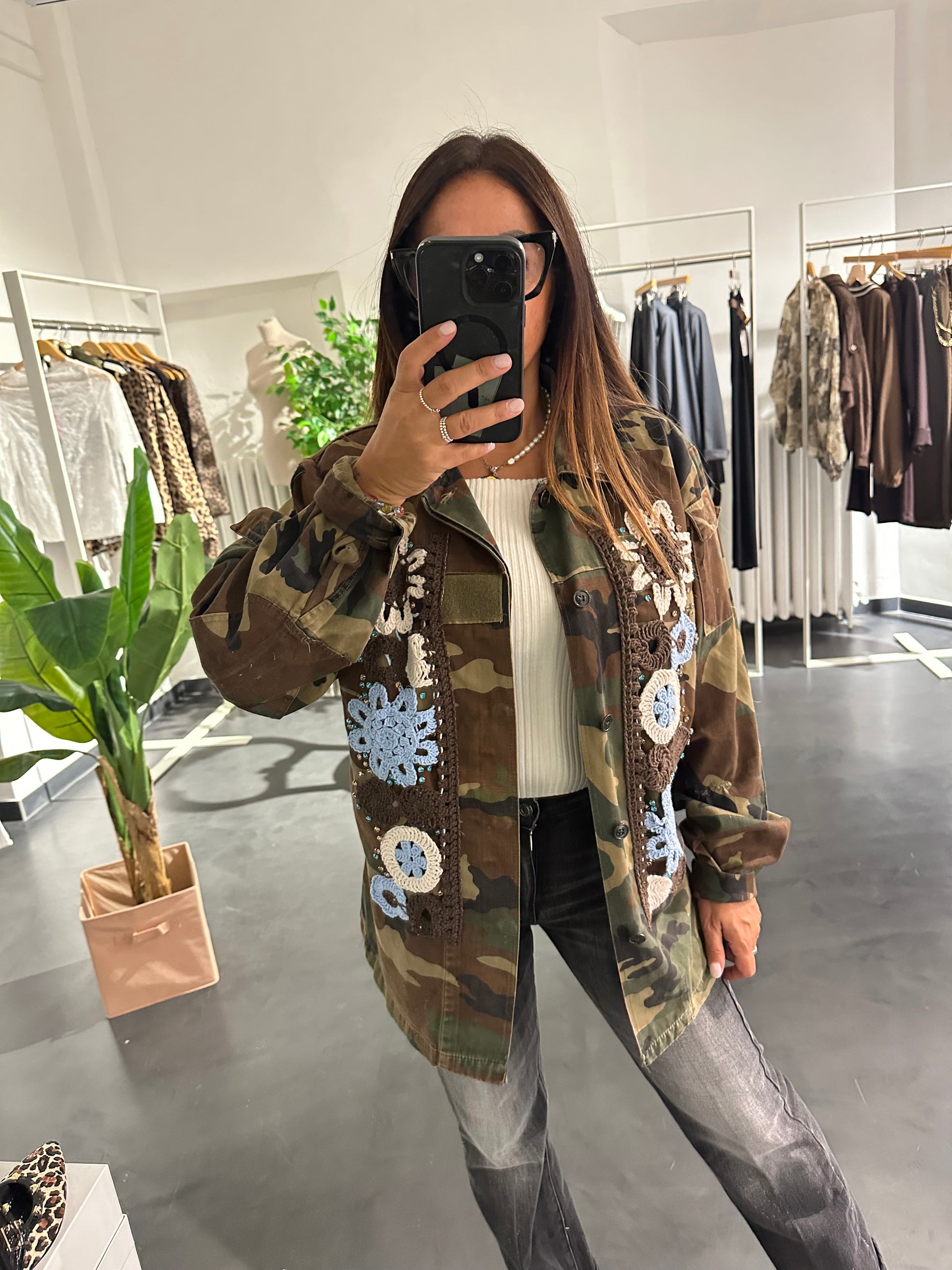 camouflage, verde militare con applicazioni di strass e ricamo
