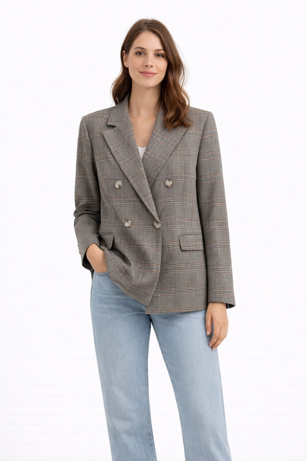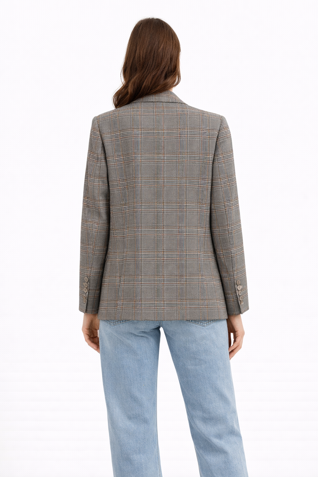 Blazer doppiopetto in fantasia Principe di Galles, dal taglio moderno e lineare. Realizzato in un tessuto strutturato ma confortevole, mantiene perfettamente la forma senza risultare rigido. Collo a rever ampio, chiusura frontale con bottoni tono su tono e tasche con pattina.