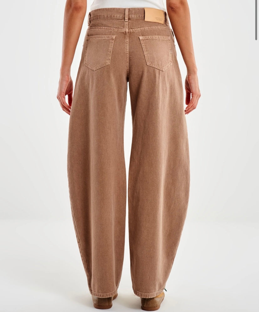 Jeans ampio a vita media modello cinque tasche. Chiusura frontale con zip e bottone in metallo. Gamba lunga ed ampia effetto baloon.