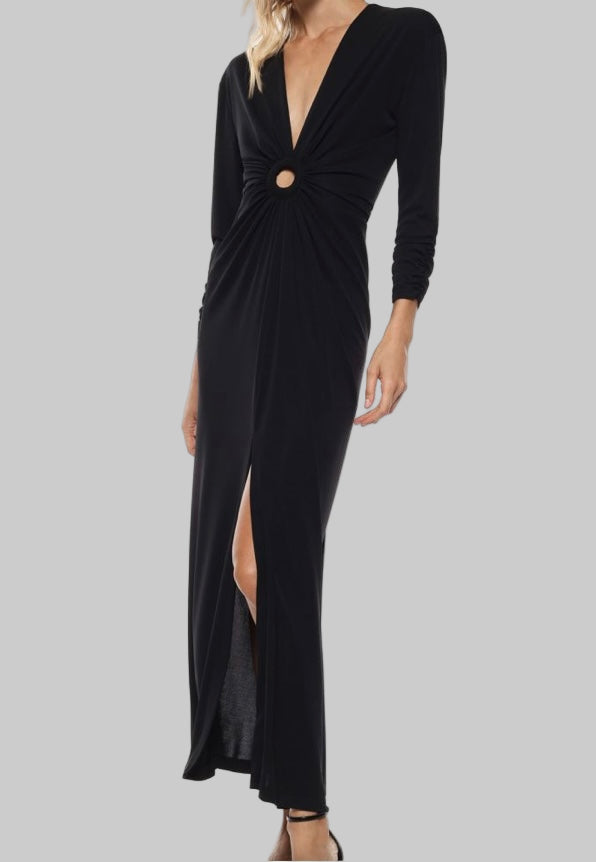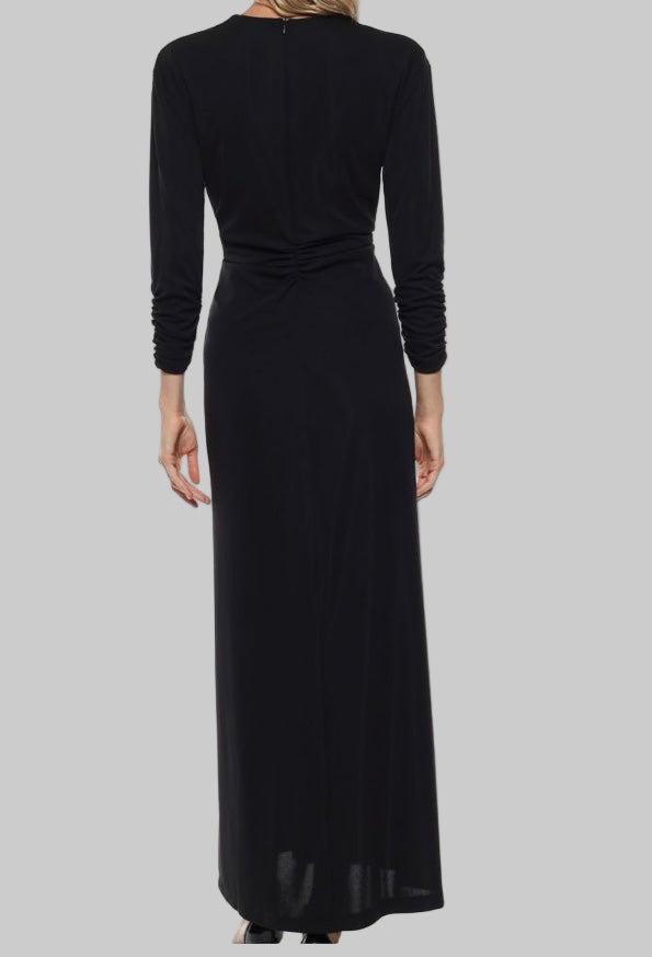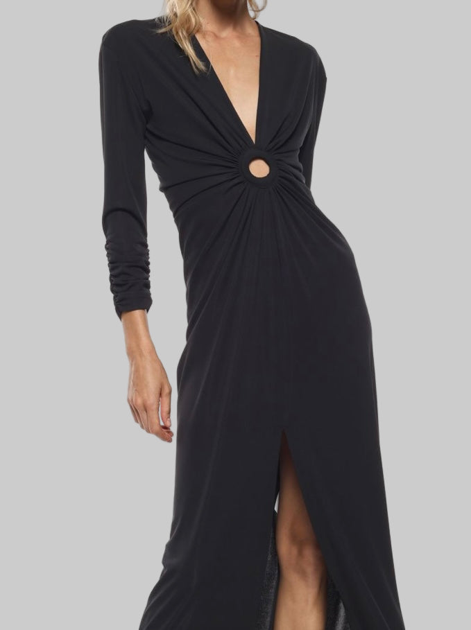 Abito lungo caratterizzato da una silhouette fluida e dettagli drappeggiati che si concentrano in un nodo centrale all'altezza del busto. Le maniche lunghe aggiungono una nota di sofisticazione, mentre lo spacco anteriore amplia le possibilità di movimento. Una scelta distintiva per chi cerca espressione personale e versatilità.